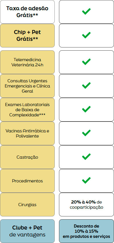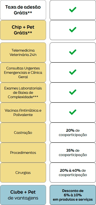 LIGHT e LIGHT Sênior: consultas generalistas, vacinas importadas, urgência e emergência, exames laboratoriais, exames de imagem básicos, +Pet Call e Clube de Vantagens +Pet.